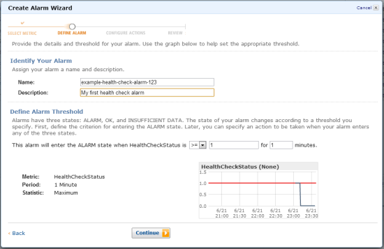 From here, you can create an alarm just like for any other CloudWatch metric, and you can use the alarm to trigger SNS notifications (for example, to send an email to yourself) if your endpoint goes down: