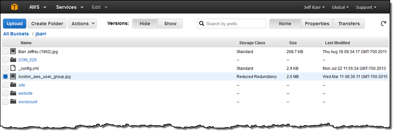 Here’s how you set up a rule for incomplete multipart uploads using the Console. Start by opening the console and navigating to the desired bucket (mine is called jbarr):