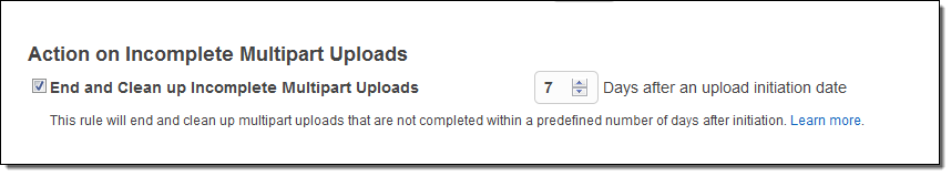 Incomplete Multipart Uploads – S3’s multipart upload feature accelerates the uploading of large objects by allowing you to split them up into logical parts that can be uploaded in parallel.  If you initiate a multipart upload but never finish it, the in-progress upload occupies some storage space and will incur storage charges. However, these uploads are not visible when you list the contents of a bucket and (until today’s release) had to be explicitly removed.