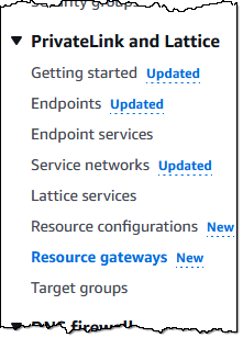 Resource Gateway – Provides a point of ingress to a VPC so that clients can access resources in the Resource Owner VPC, as indicated by the Resource Configurations that are associated with the gateway. One Resource Gateway can make multiple resources available.