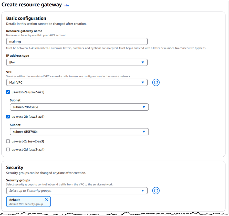 I assign a name (main-rg) and an IP address type, then pick the VPC and the private subnets where the gateway will have a presence (this is a one-shot selection that cannot be changed without creating a new Resource Gateway). I also choose up to five security groups to control inbound traffic: