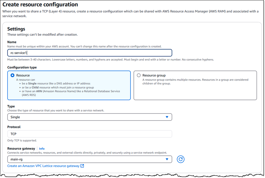 Resource Configuration – Defines a set of resources that can be accessed through a particular Resource Gateway. The resources can be referenced by IP address, DNS name, or (for AWS resources) an ARN.