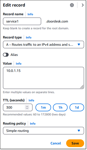 Now I need to create my first Resource Configuration. Let’s say that I have a HTTPS service running on an EC2 instance on a private subnet in my Resource Owner VPC. I assign a DNS name to the service and use a Amazon Route 53 Alias record which returns the IP address of the instance: