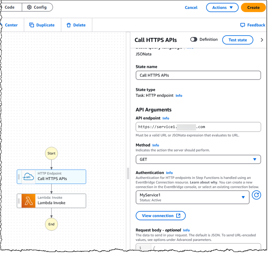 The connection is created and ready within minutes. Then I use it in my Step Functions workflows by using the HTTP Task, selecting the connection, entering the URL of my API endpoint, and choosing an HTTP method: