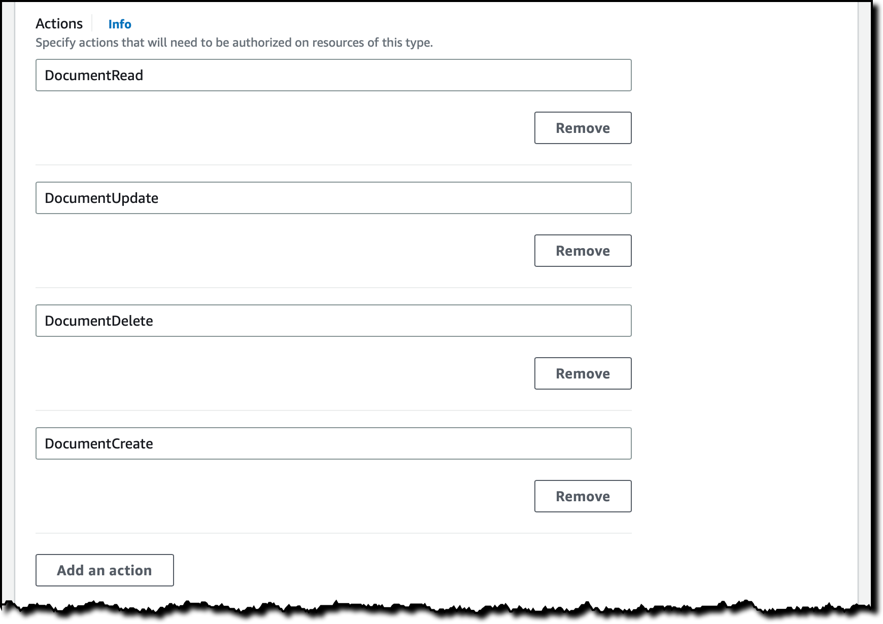 I specify four actions for the Document resource type: