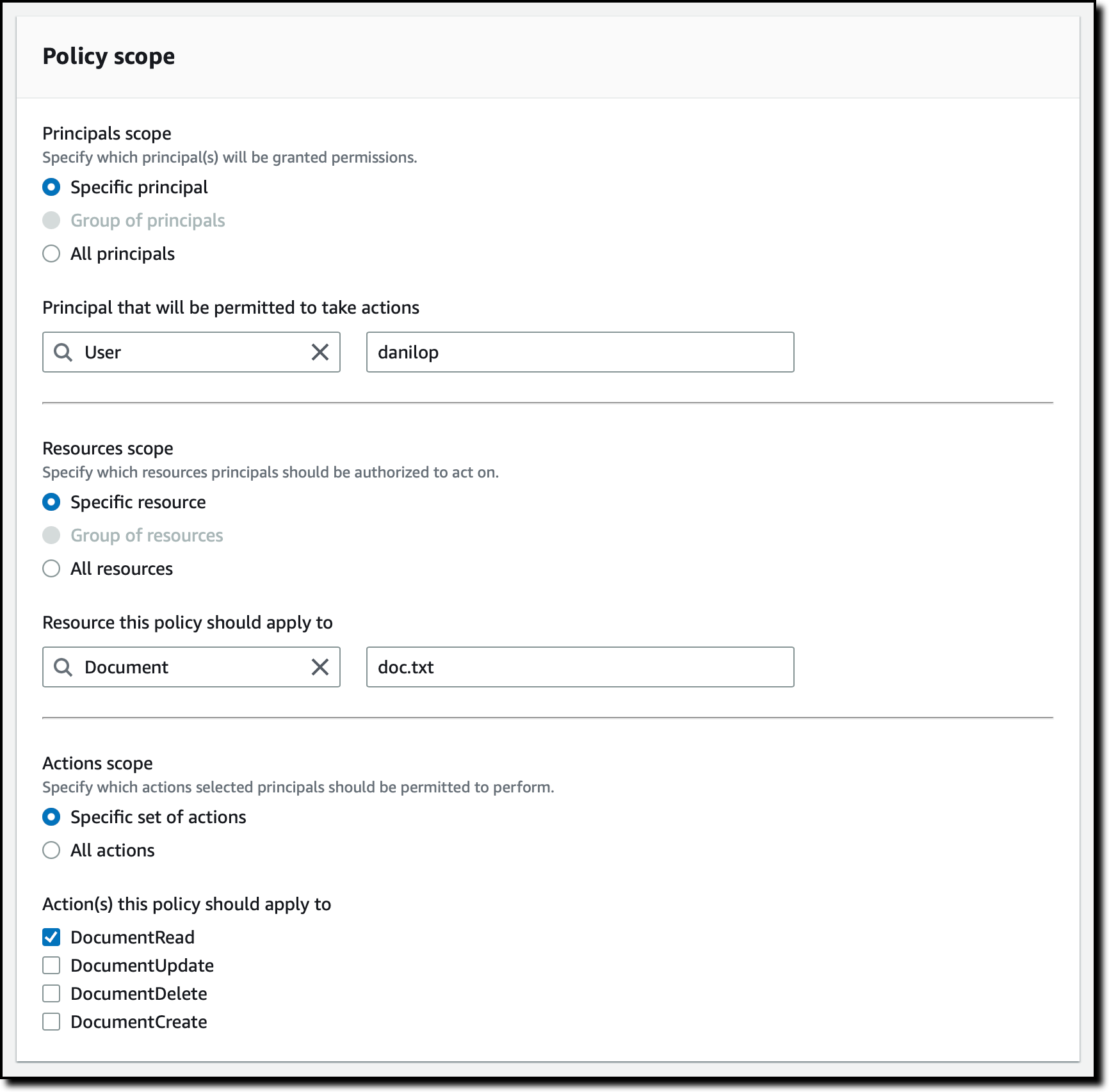 As part of the policy store creation, I create a first policy to give read access to user danilop to the doc.txt document.