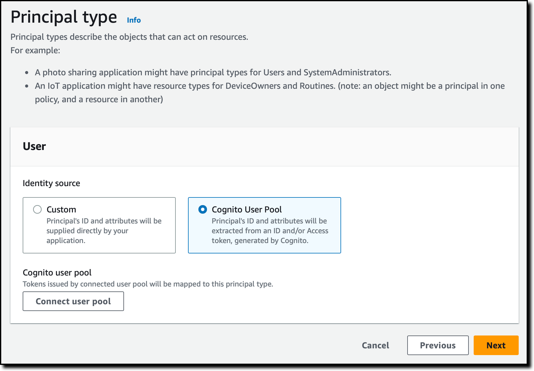 Now, I configure the User principal type. I can use a custom configuration to integrate an external identity source, but in this case, I use an Amazon Cognito user pool that I created before. I choose Connect user pool.