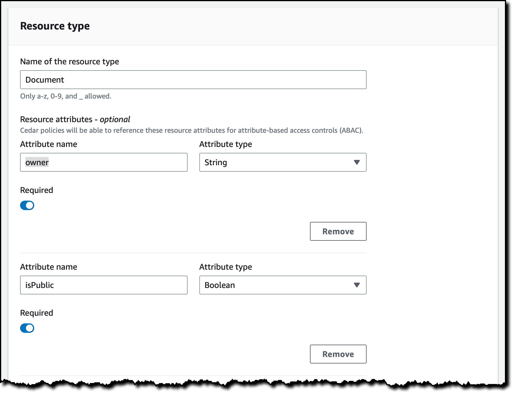 I enter the name of the resource type and add two required attributes: