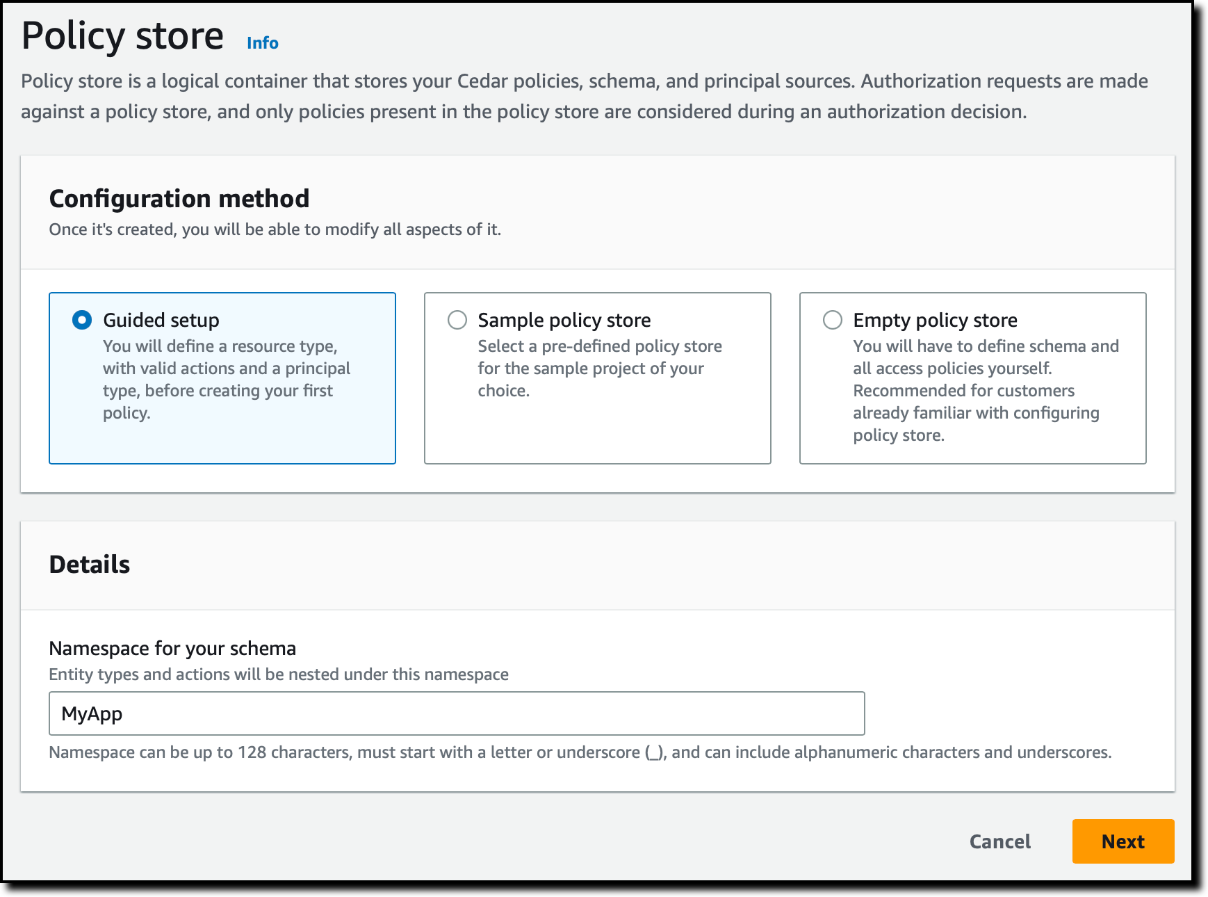 To configure the new policy store, I can use different methods. I can start with a guided setup, a sample policy store (such as for a photo-sharing app, an online store, or a task manager), or an empty policy store (recommended for advanced users). I select Guided setup, enter a namespace for my schema (MyApp), and choose Next.