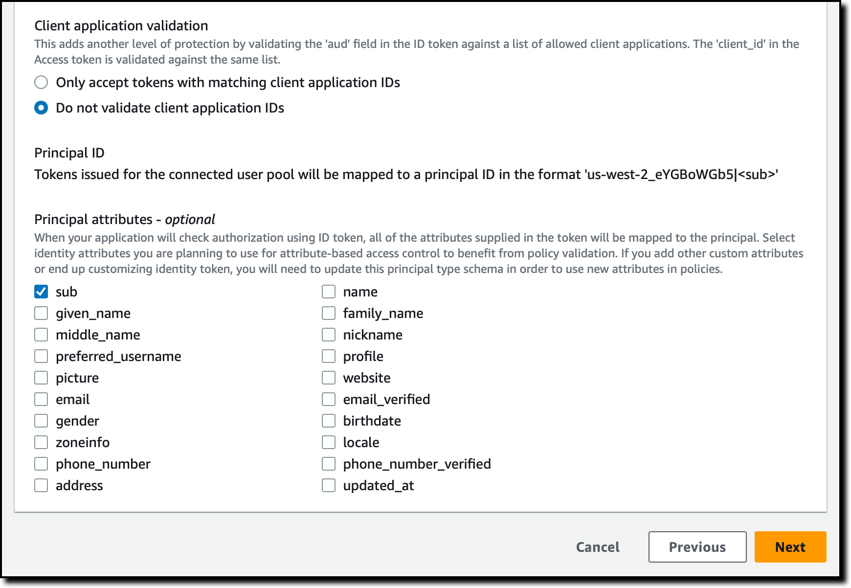 In the Principal attributes section, I select which attributes I am planning to use for attribute-based access control in my policies. I select sub (the subject), used to identify the end user according to the OpenID Connect specification. I can select more attributes. For example, I can use email_verified in a policy to give permissions only to Amazon Cognito users whose email has been verified.