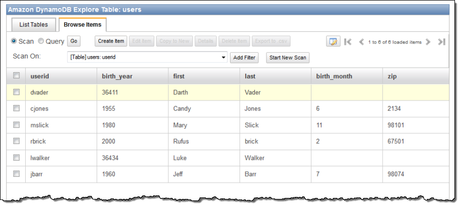 The AWS Management Console now supports scanning on secondary indexes. Suppose I have the following items in my table: