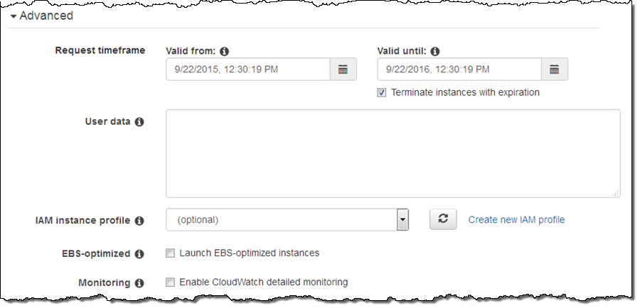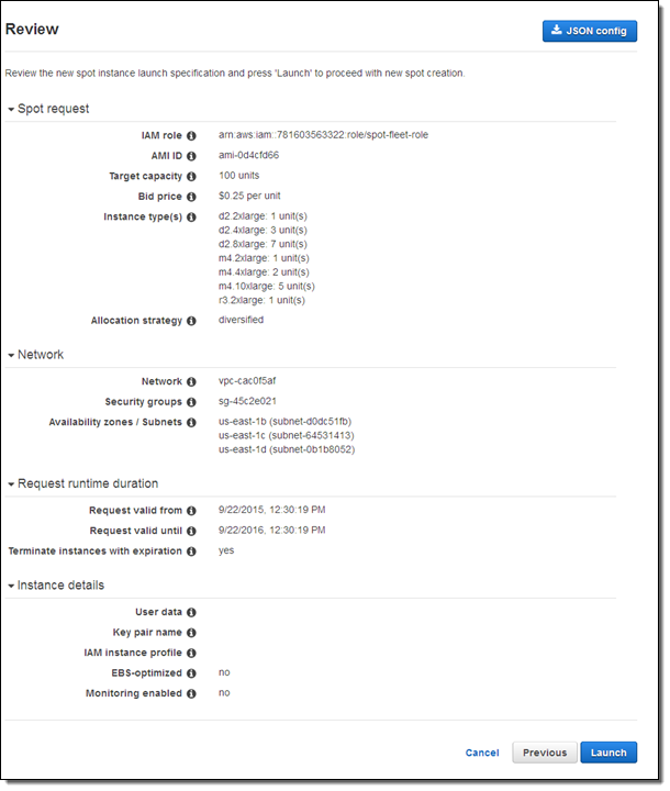 In addition to CLI and API support, you can now design and launch Spot fleets using the new Spot Instance Launch Wizard. The new wizard allows you to create resource-oriented bids that are denominated in instances, vCPUs, or arbitrary units that you can specify when you design your fleet. It also helps you to choose a bid price that is high enough (given the current state of the Spot market) to allow you to launch instances of the desired types.
