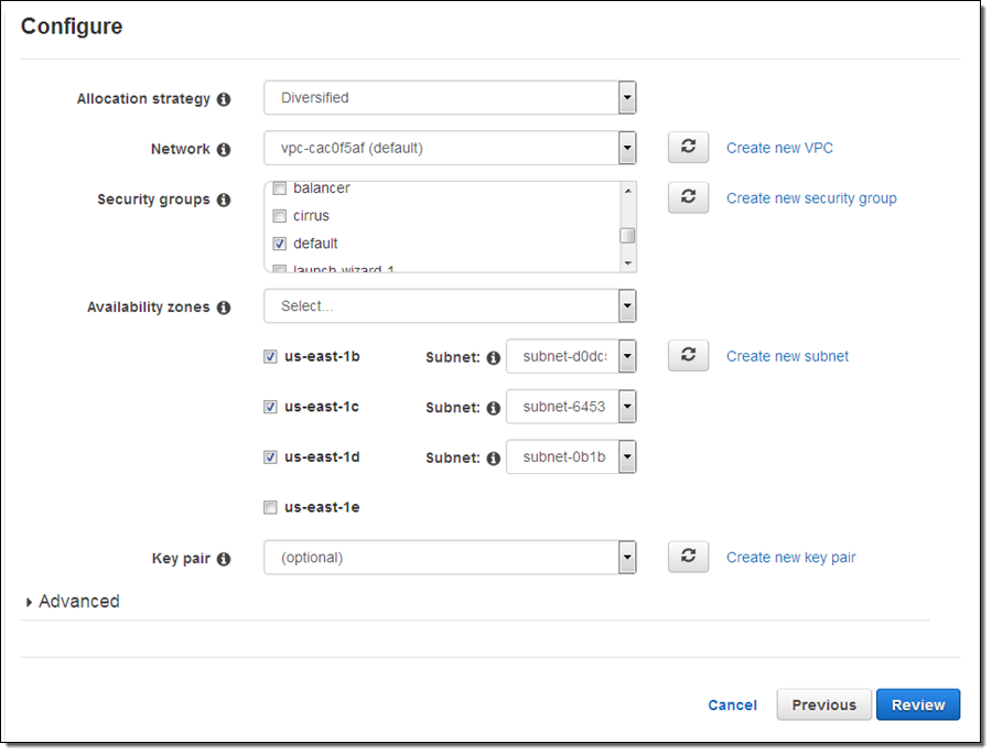 Now that I have designed my fleet, I can configure it by choosing the allocation strategy (diversified or lowest price), the VPC, security groups, availability zones / subnets, and a key pair for SSH access: