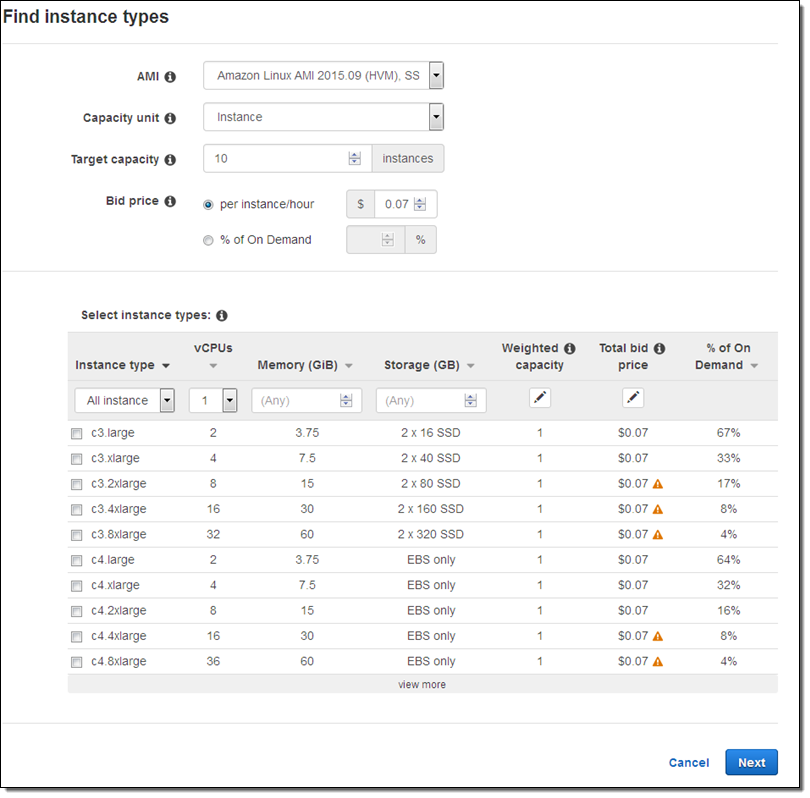 I start by choosing the desired AMI (stock or custom), the capacity unit (I’ll start with instances), and the amount of capacity that I need. I can specify a fixed bid price across all of the instance types that I select, or I set it to be a percentage of the On-Demand price for the type. Either way, the wizard will indicate (with the “caution” icon) any bid prices that are too low to succeed: