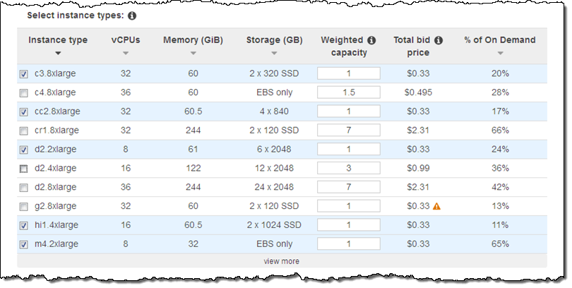 As you can see from the screen shot above, I have chosen all of instance types that offer weighted capacity at less than $0.35 / unit.