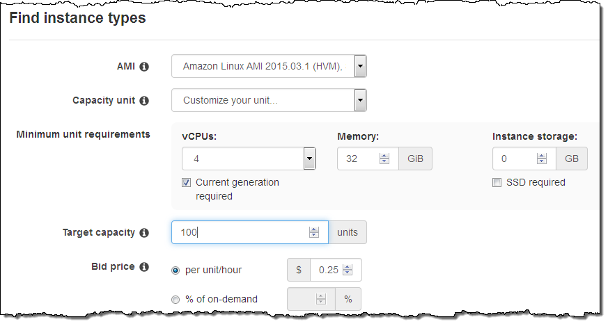 I can also make resource-oriented bids using a custom capacity unit. When I do this I have even more control over the bid. First, I can specify the minimum requirements (vCPUs, memory, instance storage, and generation) for the instances that I want in my fleet: