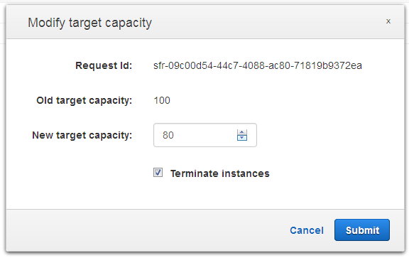We are also giving you the ability to modify the size of an existing fleet. The new ModifySpotFleetRequest allows you to make an existing fleet larger or smaller by specifying a new target capacity.