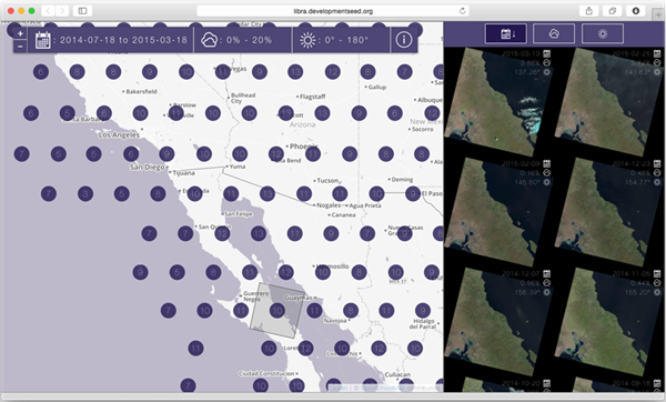 Development Seed has updated the popular open source landsat-util library to use data from Landsat on AWS. Now developers who rely on landsat-util can access Landsat data more quickly and with more processing options. Learn more about the updates to landsat-util. Here’s a screen shot of their Libra image browser: