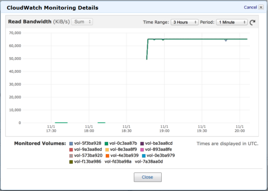 In order to achieve this throughput, the volumes were pre-warmed and optimized for queue depth as described in our EBS Volume Performance document.