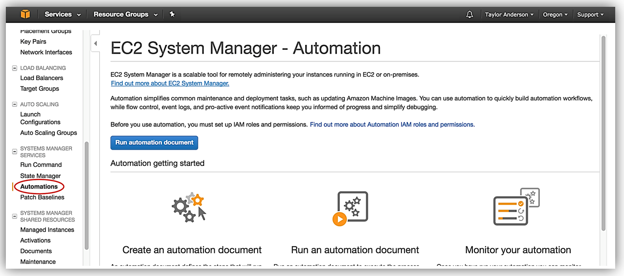 - In the EC2 console, choose Systems Manager Services, Automations.