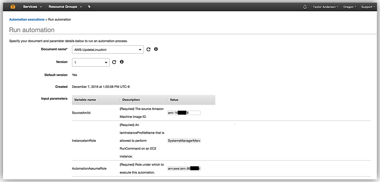 - For AutomationAssumeRole, enter the ARN of the service role you created for Automation. For more details, see Configuring Access to Automation.