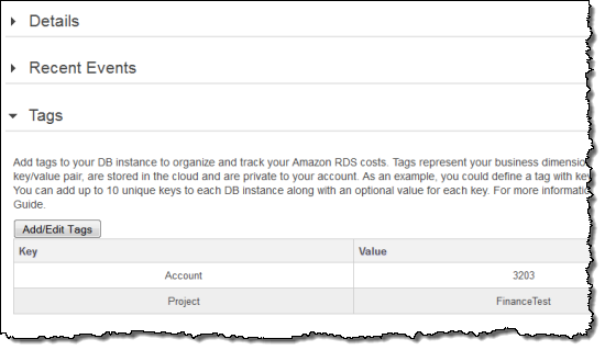 You can now use tags to organize your Amazon RDS resources. Also, as I have noted in my companion blog post, you can reference these tags in IAM policies in order to manage access to RDS resources and to control the actions that can be applied to the resources. You can even use the tags to track costs by grouping expenses for similarly tagged resources.