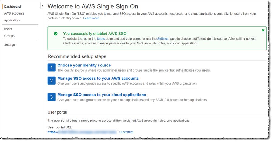 Having downloaded the file, I open another browser tab (I leave the Azure AD tab open, as I need to come back to it), and sign into the AWS Single Sign-On Console. From the dashboard home, I click the Enable AWS SSO button. After a few seconds, my account is enabled for single sign-on and I can proceed to configure the connection with Azure AD.