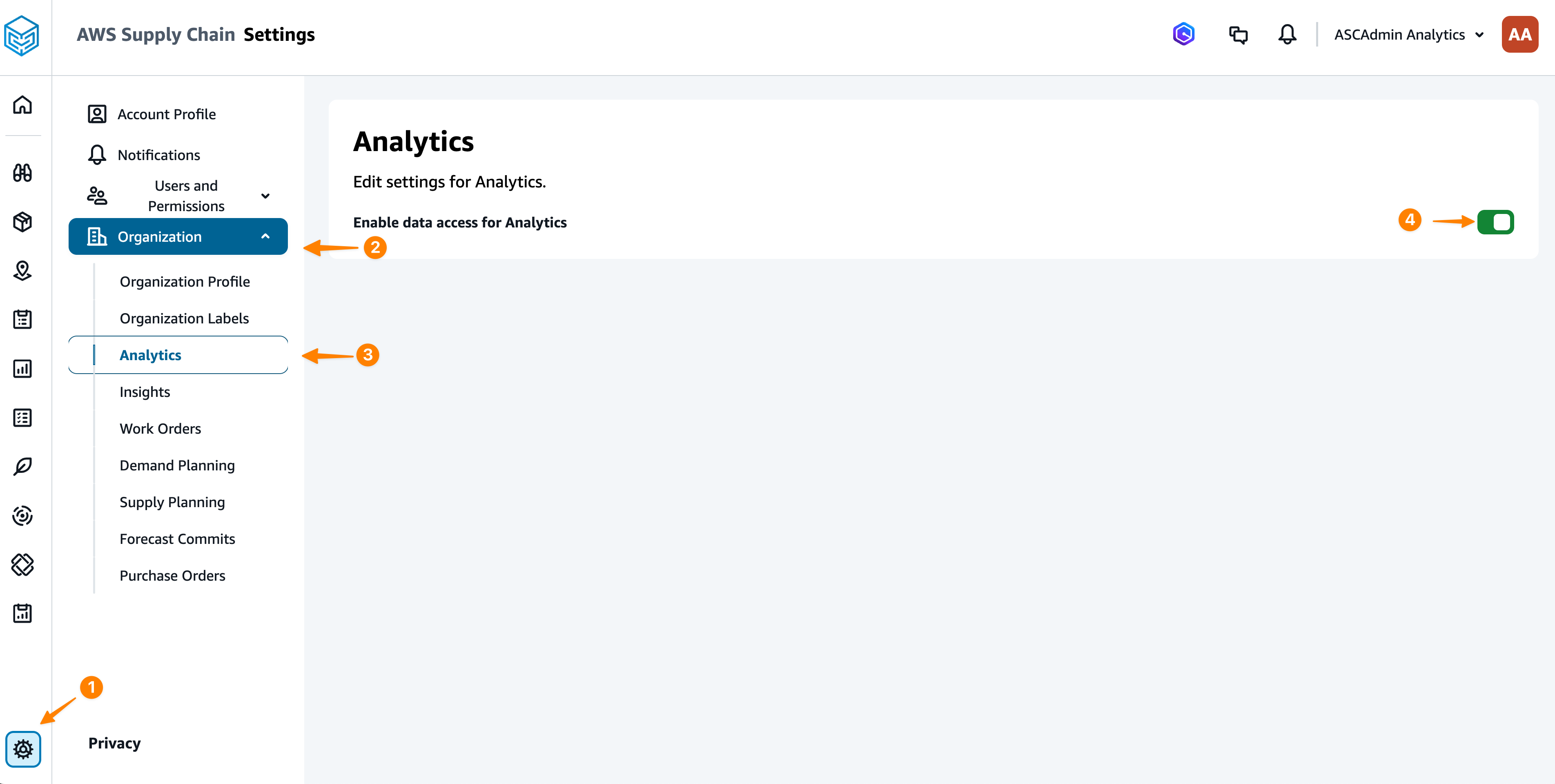 The first step is to enable AWS Supply Chain Analytics. To do this, navigate to Settings, then select Organizations and choose Analytics. Here, I can Enable data access for Analytics.