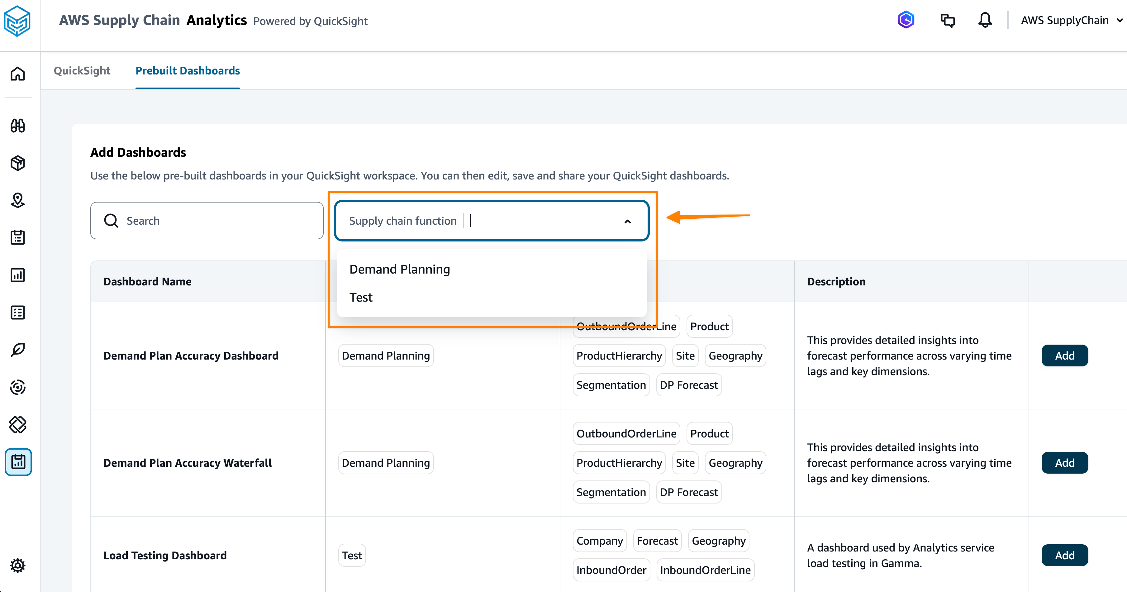 Then, I can select the prebuilt dashboards I need in the Supply Chain Function dropdown list: