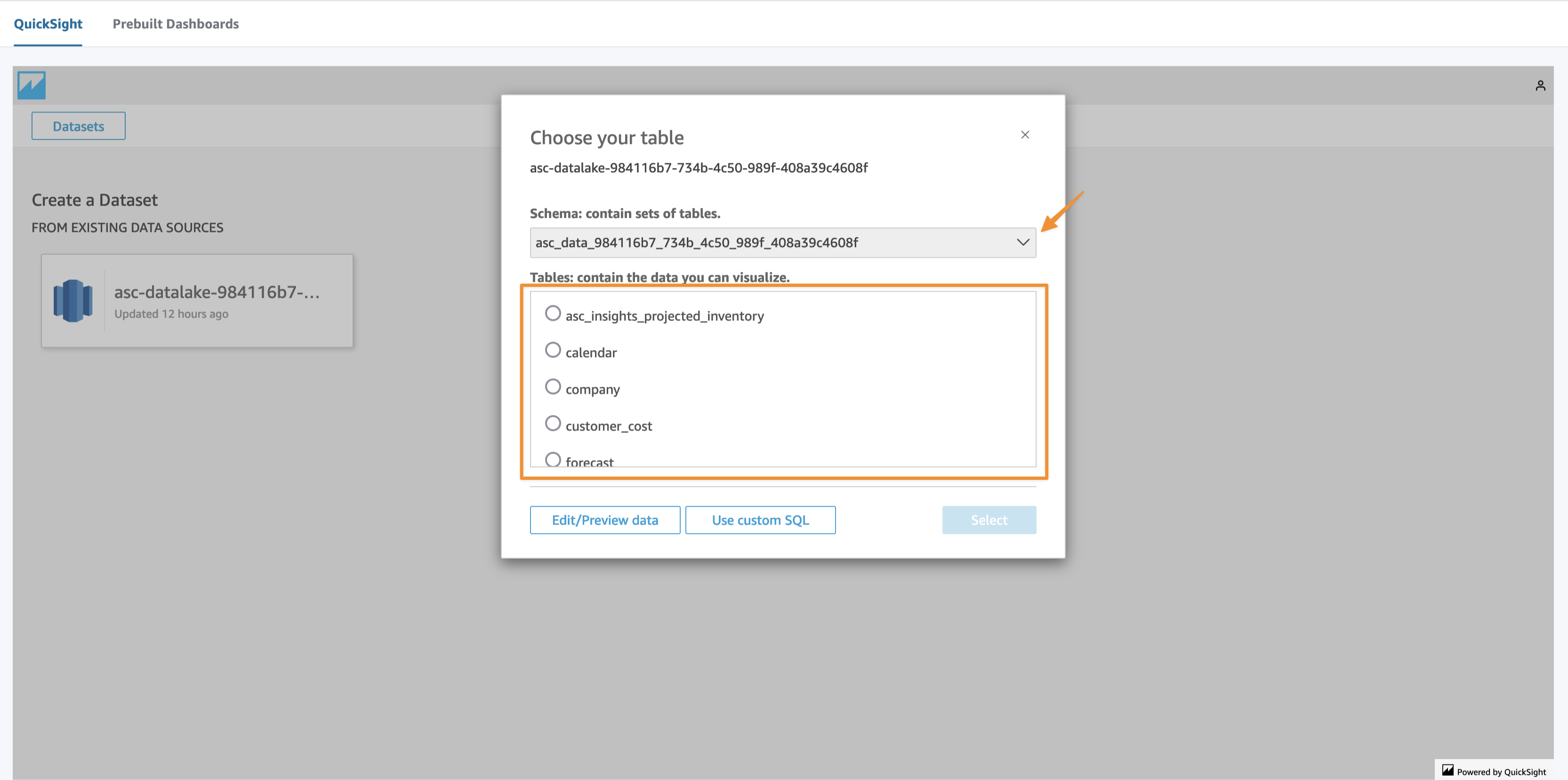 When exploring available datasets in AWS Supply Chain, I can see two distinct schemas in the dropdown menu: one prefixed with asc_data and another prefixed with asc_custom_data.