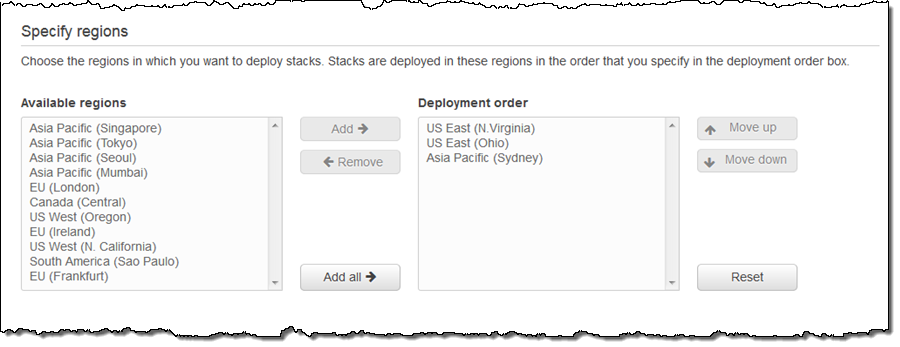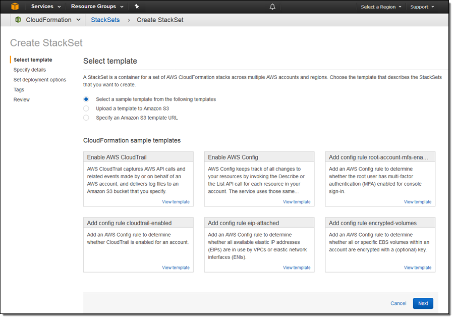 You can use your existing CloudFormation templates (taking care to make sure that they are ready to work across accounts and regions), create new ones, or use one of our sample templates. We are launching with support for the AWS partition (all public regions except those in China), and expect to expand it to to the others before too long.