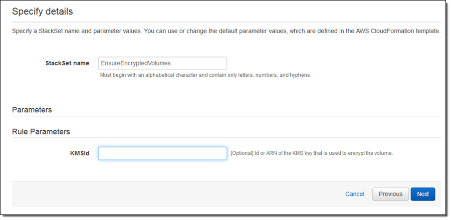 I give my StackSet a name. The template that I selected accepts an optional parameter, and I can enter it at this time: