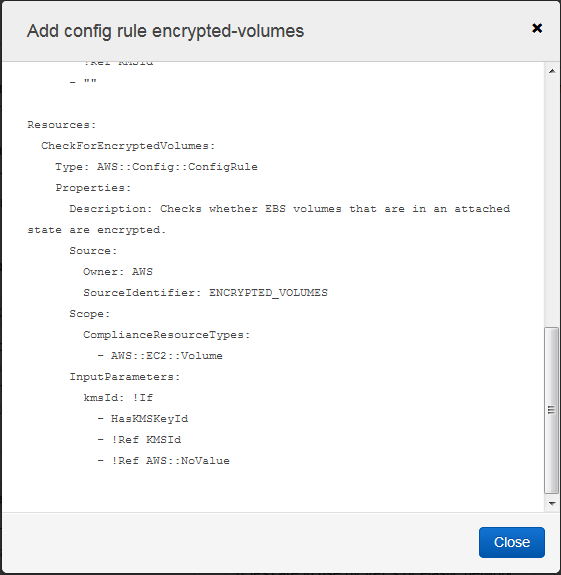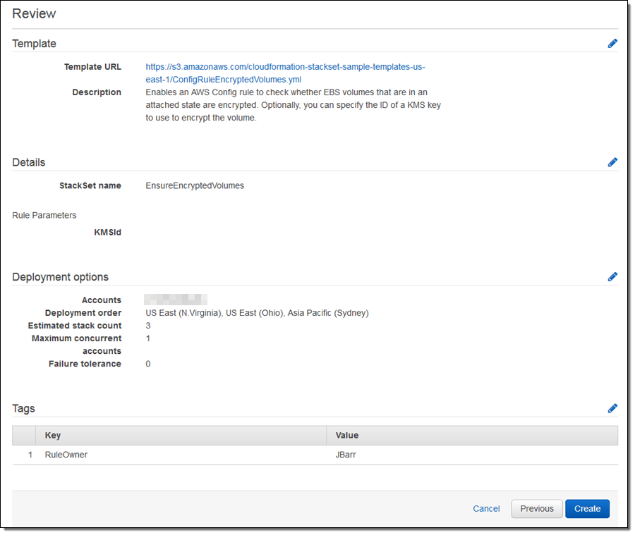 Using the Console, I start by clicking on Create StackSet. I can use my own template or one of the samples. I’ll use the last sample (Add config rule encrypted volumes):