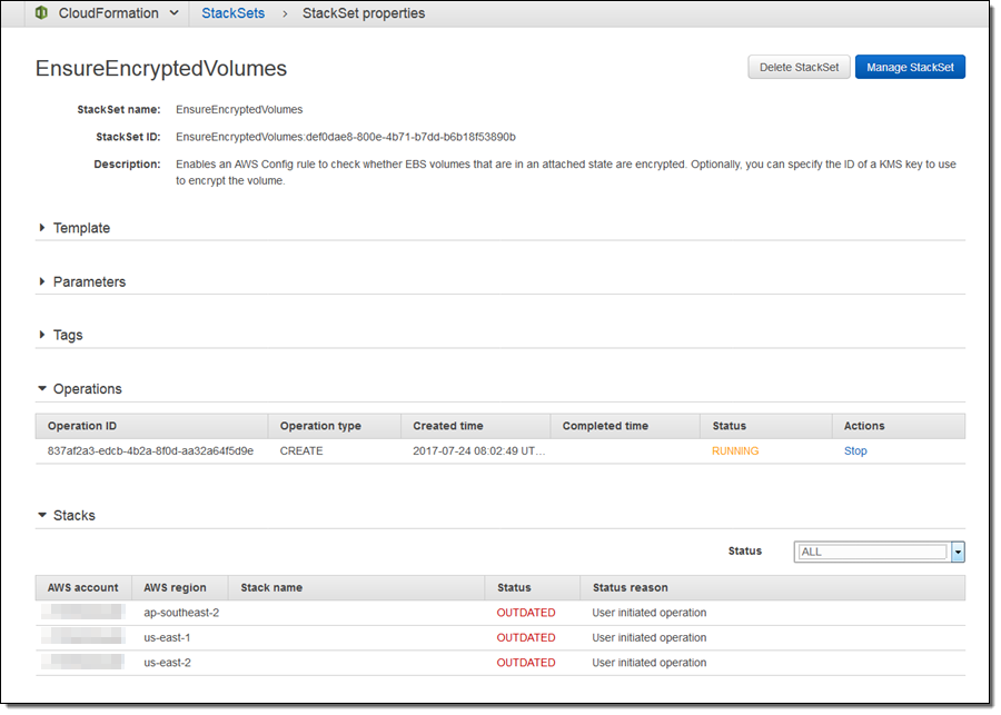 After my initial deployment, I can click on Manage StackSet to add additional accounts, regions, or both, to create additional stacks: