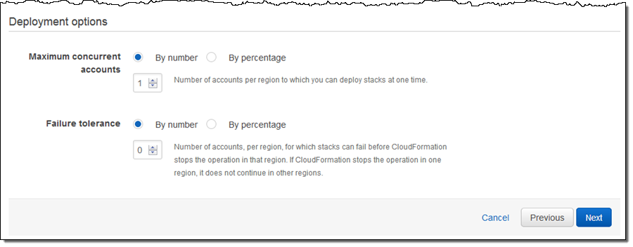 Deploying a template initiates creation of a CloudFormation stack in an account/region pair. Templates are deployed sequentially to regions (you control the order) to multiple accounts within the region (you control the amount of parallelism). You can also set an error threshold that will terminate deployments if stack creation fails.