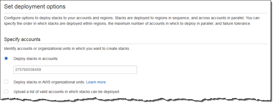 Next, I choose the accounts and regions. I can enter account numbers directly, reference an AWS organizational unit, or upload a list of account numbers: