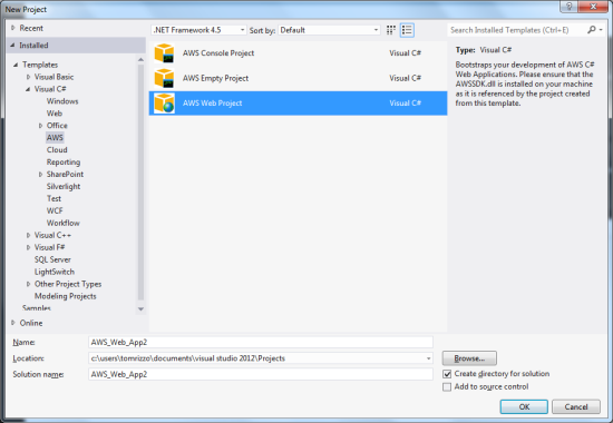 To support building applications on Windows with .NET, AWS supports the new .NET framework shipped with Windows Server 2012 – .NET 4.5. With integrated Visual Studio support, including the new Visual Studio 2012, getting started with building AWS applications is as easy as creating an AWS project in Visual Studio as shown below..