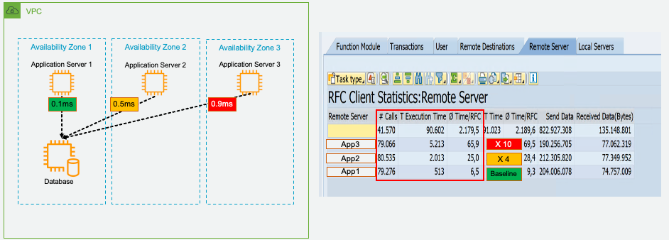 To understand the impact of Inter-AZ network latency to the backflush process (transaction MFBF) we ran the tests illustrated in Figure 2, which indicates a 4-10x performance decrease in RFC execution time when running on application servers 2 & 3 which are located in a different AZ than the database server.