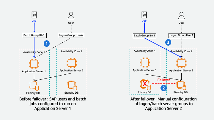 In order to ensure optimal performance for SAP transactions and batch jobs, you can enable automatic switching of SAP logon groups (transaction SMLG), RFC server groups (transaction RZ12) and/or batch server groups (transaction SM61) when there is a failover of database server. This ensures that the performance-critical transactions and batch jobs are always running on application servers in the same AZ as the database server.