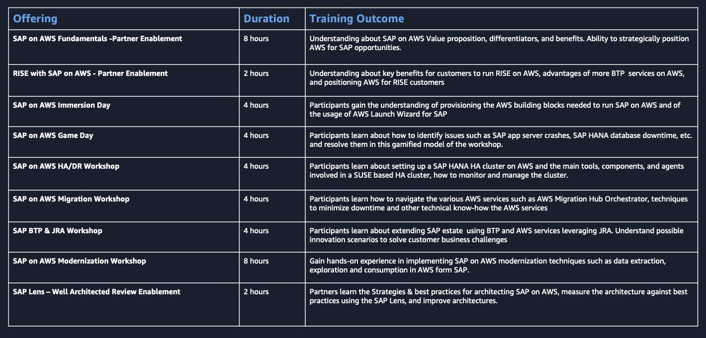 In addition to the above, our AWS SAP Partner Solutions Architect team delivers hands-on trainings to up-skill AWS Partners on a full range of AWS for SAP topics. These trainings facilitate development of your SAP practice; ideally suited for SAP enterprise architects, SAP BASIS and cloud architects, SAP project managers, pre-sales architects, and SAP sellers at partner organizations. You can reach out to your AWS point-of-contact to request any of these trainings for your teams.