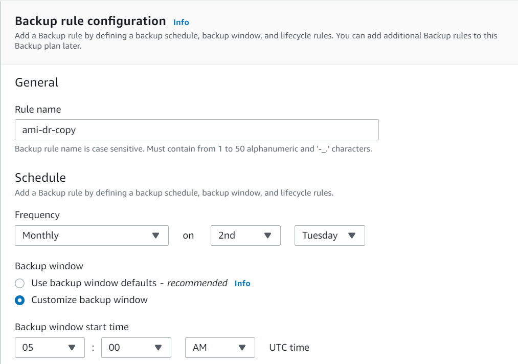 Next, since you are using another region for DR, choose that as the destination region to copy the backups or AMIs. The destination region can be in a different AWS account, with a different backup vault for the DR side backups. The frequency can be aligned with your maintenance window so that any changes made to the source during maintenance can be replicated to the DR region with AMI copy.