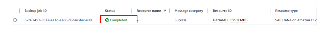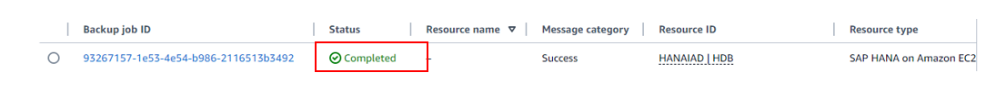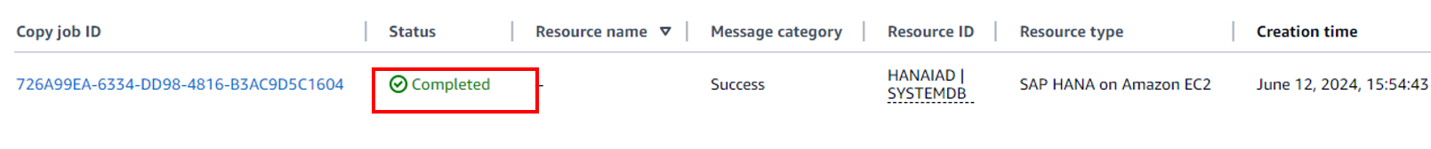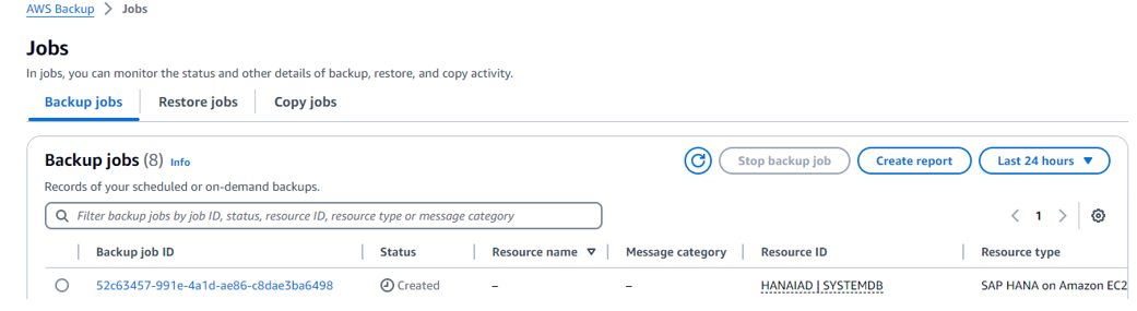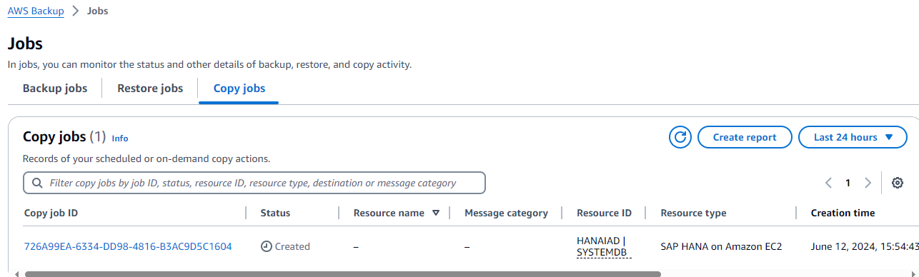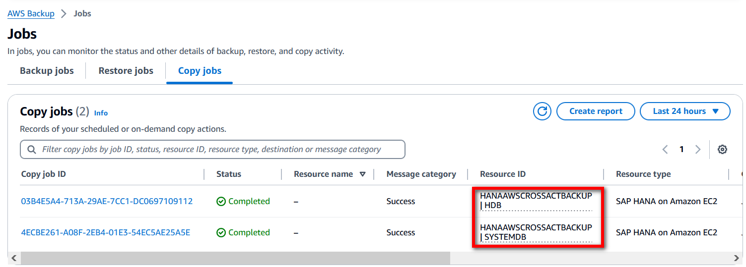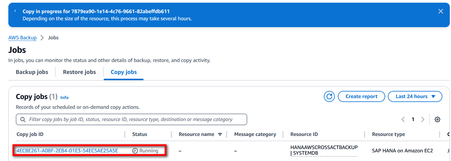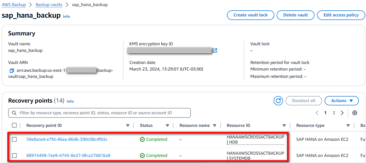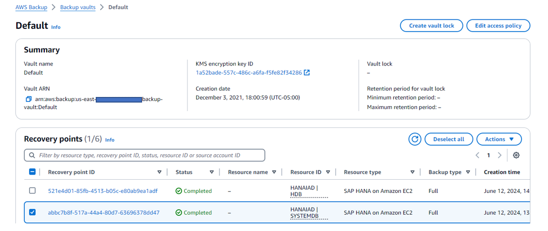 In this example we already have successful on-demand backup of both HANA SystemDB and TenantDB in the source account. You can also use scheduled backup plan to copy backups across AWS accounts as in the AWS documentation Scheduling Cross-Account backup. Follow the steps below to perform a Cross-Account copy of the on-demand HANA database backup from the source account to destination account: