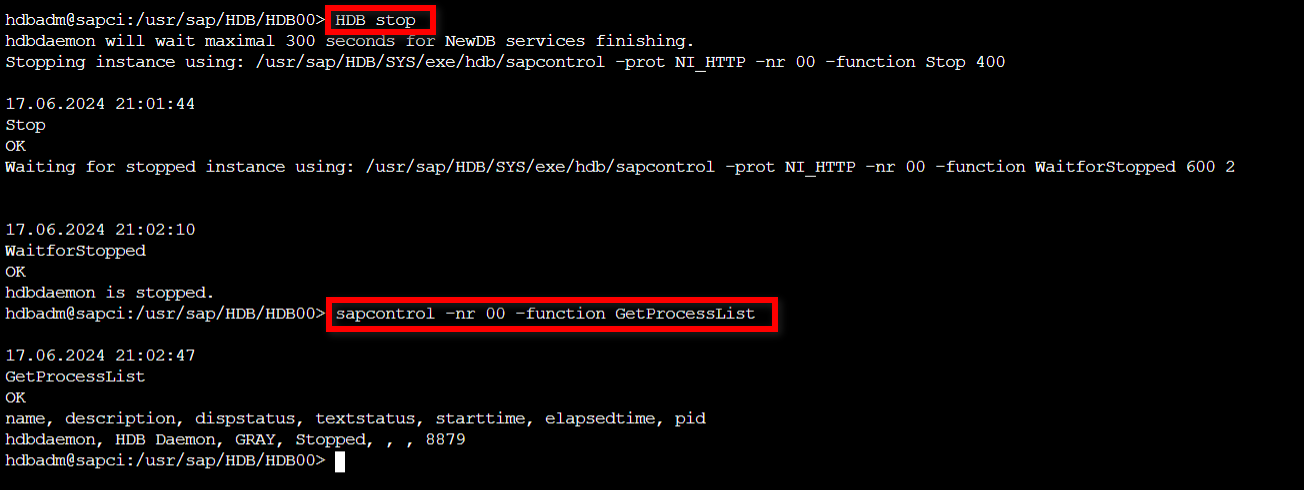 12. Before you continue with the restore steps, ensure the HANA database on the destination account is stopped with the HDB stop command. Check status of SAP processes with sapcontrol command and note the hdbdaemon status is ‘GRAY’ and ‘Stopped’.