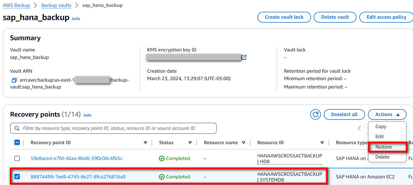 13. In the destination account AWS Backup console, Choose the Recovery Point ID of the copied HANA database SystemDB backup. Under Actions, Choose Restore.