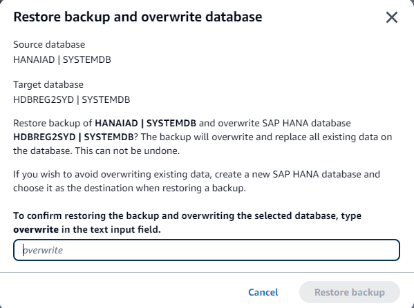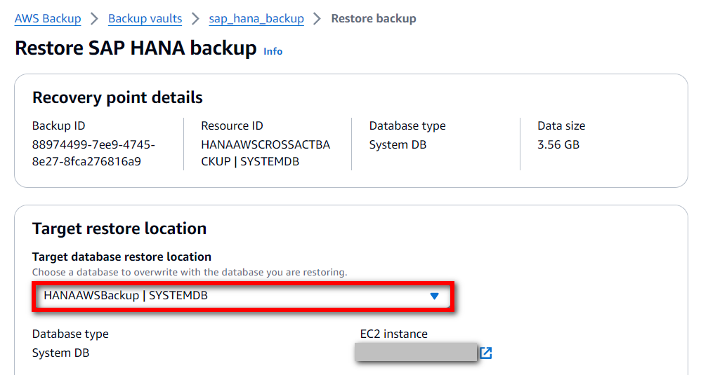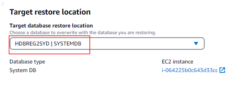 15. On the next screen, under Target database restore location select the SystemDB of the SAP HANA database that you want to be overwritten with the copy from the source Region.