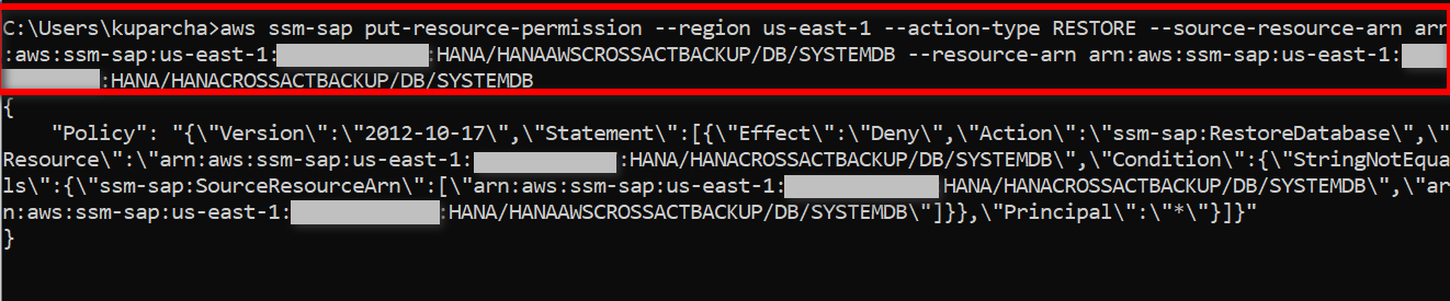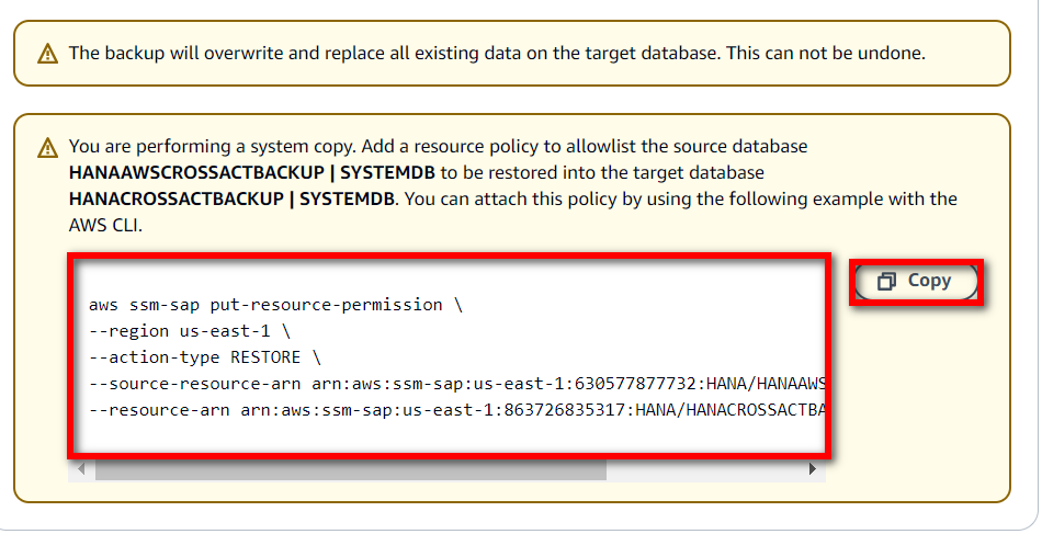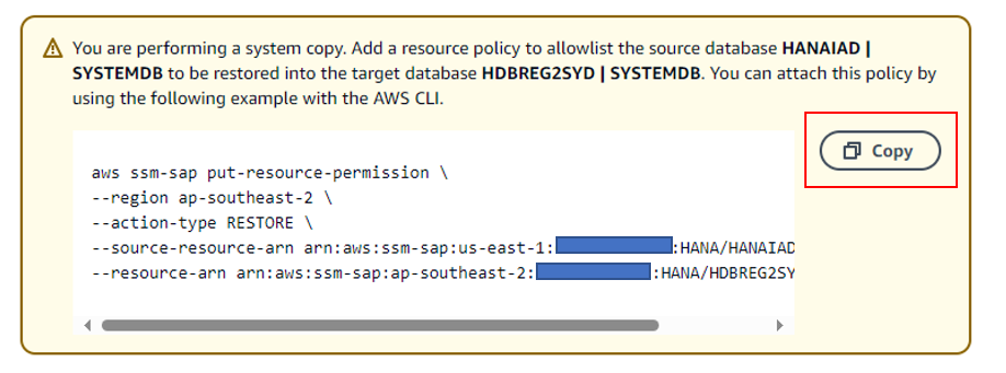 16. Click on Copy and execute the command in the target SAP HANA database using AWS CLI.