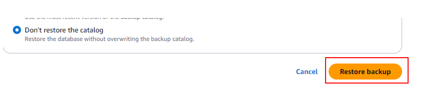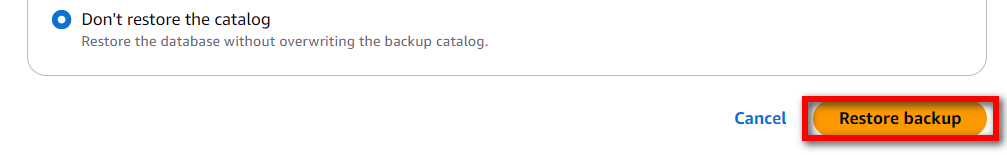 17. Under Advanced restore settings, select Don’t restore the catalog and click on Restore backup.