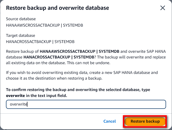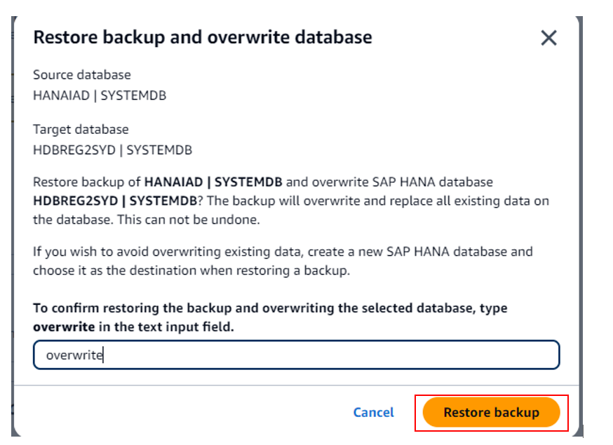 19. Under the Restore backup and overwrite database, type overwrite. Choose Restore backup.
