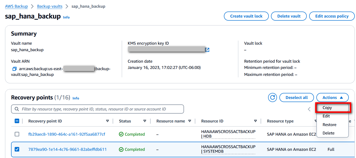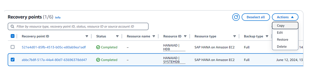 2. In Backup vaults, choose your source backup vault. Select the Recovery Point ID for the SAP HANA database SystemDB backup. Under Actions Click Copy.