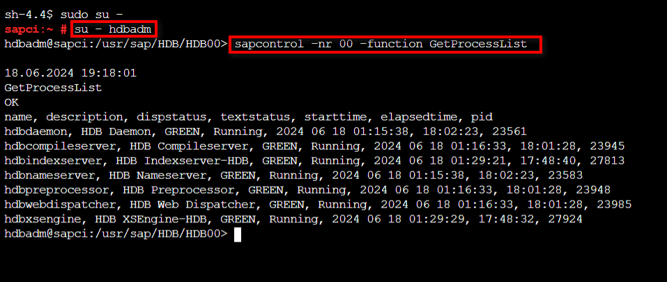 22. Go to EC2 console, login to the HANA database on the destination account using AWS Session manager. Login as <sid>adm user and check status of SAP processes with sapcontrol command. Verify that the HANA SystemDB and TenantDB database is restored successfully and all the process are showing GREEN status as below.